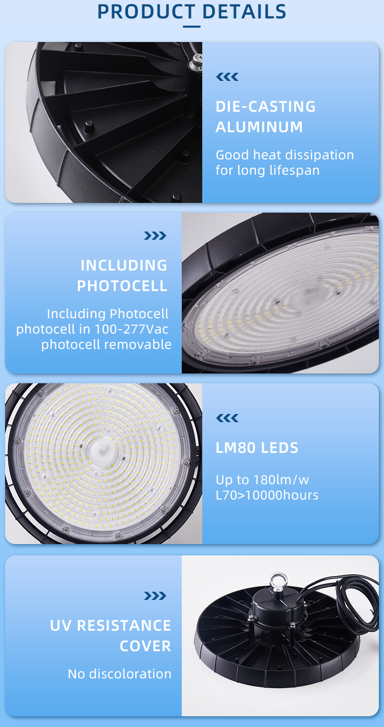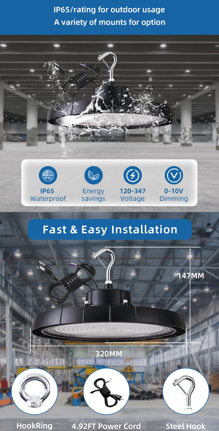 High performance LED fixture 150Lm/W 0-10v dimmable optional With motion sensor function 4KA/6KV surge protection included IP65 Photometrics 60° 90° 110° DLC ETL CE ROHS listed Philips, 5 years warranty